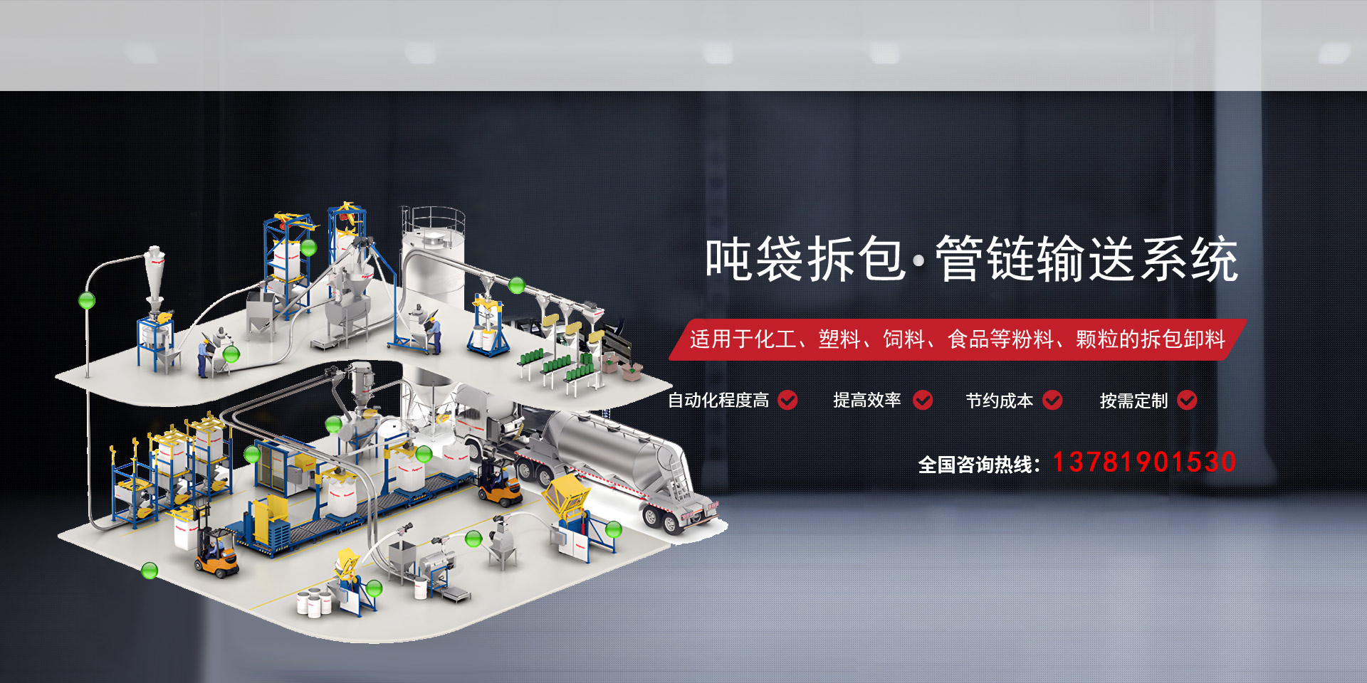 噸袋拆包機+管鏈輸送機投料到多個反應釜方案噸袋破袋機為了防止開袋過程中粉塵飛揚對環境和物料的雙重影響,減少操作工人繁重的體力勞動,杜絕粉塵對操作者健康的影響,以自動化的開袋系統取代傳統人工開袋工作